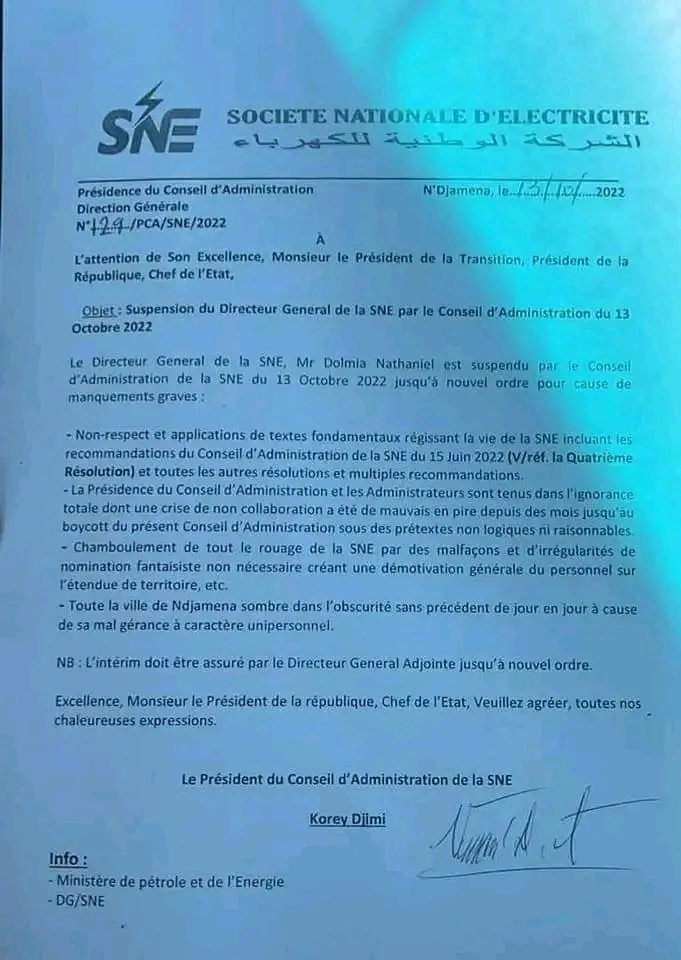 🔴🇷🇴 #Tchad: Le Directeur Général de la #SNE est suspendu pour faute grave.
